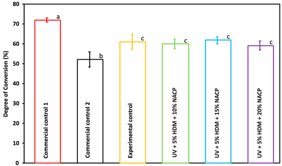Degree of conversion for commercial controls 1 and 2, experimental control, and experimental groups (mean ± SD; n = 3). Groups with different letters indicate statistically significant differences (p < 0.05).