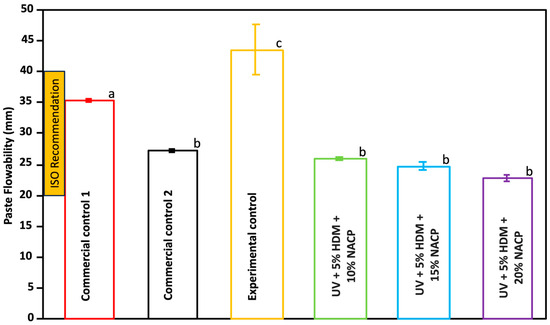 Flowability of the pastes for commercial controls 1 and 2, experimental control, and experimental groups (mean ± SD; n = 3). Different letters indicate statistically significant differences between groups (p < 0.05).