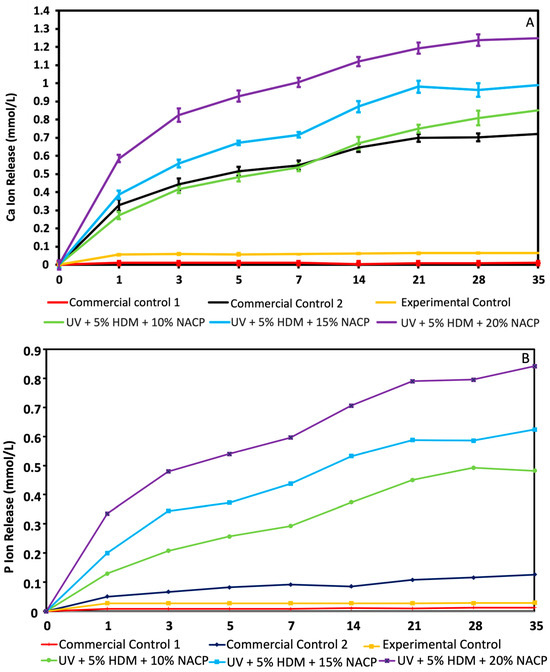 Release of calcium (Ca) and phosphate (P) ions over 35 days (mean ± SD; n = 3). (A) Calcium ion release and (B) phosphate ion release. Groups with different letters indicate statistically significant differences (p < 0.05).