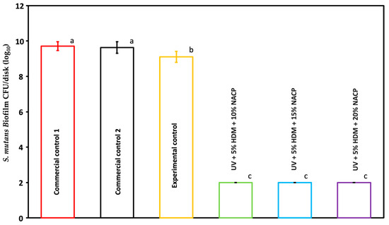 S. mutans biofilm colony-forming units (CFUs) per disk (log10) (mean ± SD; n = 6) for commercial controls 1 and 2, experimental control, and UV + 10, 15, and 20 (%) NACP coating resin. Groups with different letters indicate statistically significant differences (p < 0.05).
