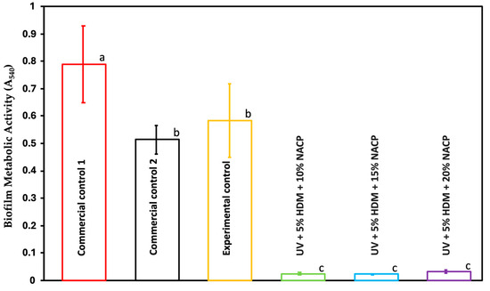 Metabolic activity of the biofilm assessed using the MTT assay for commercial controls 1 and 2, experimental control, and experimental groups (mean ± SD; n = 6). Presence of 5% DMAHDM diminished the metabolic activity of the S. mutans by ≈96.57%. Groups with different letters indicate statistically significant differences (p < 0.05).