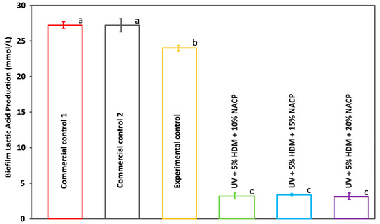 Lactic acid production by S. mutans biofilm for commercial controls 1 and 2, experimental control, and experimental groups (mean ± SD; n = 6). Groups marked with different letters show statistically significant differences (p < 0.05).