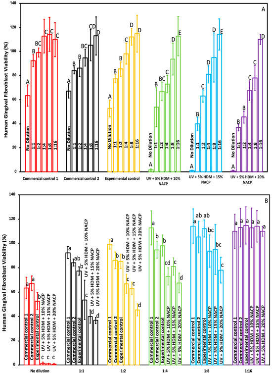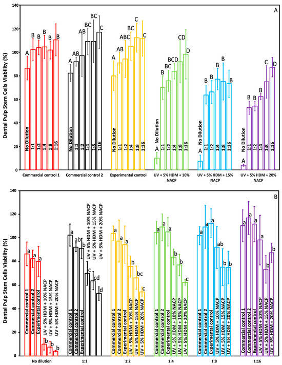 Viability of dental pulp stem cells (DPSCs) in response to the newly developed coating resin (mean ± SD; n = 3 × 3). (A) Cell viability for each group and (B) cell viability for each dilution. Dilutions in (A,B) represent the ratio of extract media to fresh fibroblast media: 1:1 = 50 µL:50 µL; 1:2 = 33.3 µL:66.6 µL; 1:4 = 25 µL:75 µL; 1:8 = 12.5 µL:87.5 µL. Groups with different letters indicate statistically.