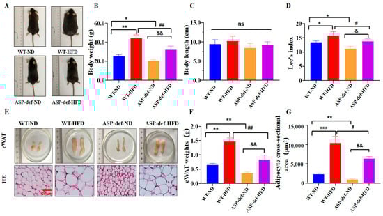 ASP-deficiency alleviates mouse obesity induced by HFD. Representative photographs (A) of C57 BL/6 mice. Body weight (B), length (C), and Lee’s index (D) were measured and calculated. Representative photographs (E) and weights (F) from eWAT in mice. Representative HE-staining images from eWAT (E) and average diameters of adipocytes from eWAT. (G) Data are presented as means ± SEM from 3 independent experiments (n = 3). Two-way ANOVAs were performed, followed by unpaired two-tailed Student’s t-tests. * p < 0.05, ** p < 0.01, *** p < 0.001 vs. WT-ND group; # p < 0.05, ## p < 0.01 vs. WT-HFD group; & p < 0.05, && p < 0.01 vs. ASP-def-ND group; ns = no significance. WT-ND: wild-type mice fed with normal diet; WT-HFD: wild-type mice fed with high-fat diet; ASP-def-ND: ASP-deficient mice fed with normal diet; ASP-def-HFD: ASP-deficient mice fed with high-fat diet; eWAT: epididymal white adipose tissue. Scale bars in the images of HE staining in (E) 20 µm. ASP: asprosin, HE staining: hematoxylin–eosin staining.