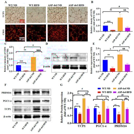 ASP-deficiency promotes angiogenesis and browning of white adipose in vivo. Representative images (A) of immunohistochemistry and immunofluorescence. Relative expression levels in situ of UCP1 (B) and CD31 (C) in eWAT normalized by adipocyte size. Expression levels of CD31 in eWAT by Western blot (D,E). Expression levels of the browning-related proteins, including PRDM16, PGC-1α, and UCP-1, in eWAT (F,G). Data are presented as means ± SEM from three independent experiments (n = 3). Two-way ANOVAs were performed followed by unpaired two-tailed Student’s t-tests. * p < 0.05, ** p < 0.01, *** p < 0.001 vs. the WT-ND group; # p < 0.05, ## p < 0.01 vs. the WT-HFD group; & p < 0.05, && p < 0.01, &&& p < 0.001 vs. the ASP-def-ND group. WT-ND: wild-type mice fed with normal diet; WT-HFD: wild-type mice fed with high-fat diet; ASP-def-ND: ASP-deficient mice fed with normal diet; ASP-def-HFD: ASP-deficient mice fed with high-fat diet; eWAT: epididymal white adipose tissue. Scale bars in (A) 20 μm. ASP: asprosin, UCP1: uncoupling protein 1, PGC1-α: PPARgamma coactivator 1, PRDM16: PRD1-BF-1-RIZ1 homologous domain-containing protein 16.