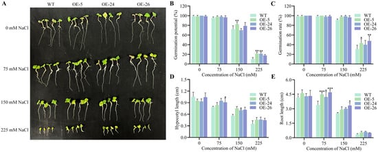 Salt stress tolerance analysis in the wild-type and DICW transgenic oilseed rape lines. (A) Phenotype comparison of the wild-type and transgenic lines after 7 d of exposure to different NaCl concentrations. (B) Germination potential after 3 d of treatment. (C) Germination percentage after 7 d of treatment. (D,E) Hypocotyl and root lengths after 7 d of treatment. The error bars indicate the standard deviation from three biological replicates (* p < 0.05; ** p < 0.01; *** p < 0.001).
