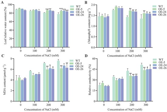 When the transgenic and non-transgenic oilseed rape seedlings were subjected to stress treatments, no significant differences were observed in the leaf relative water content, total chlorophyll content, malondialdehyde (MDA) levels, or relative conductivity under normal conditions. However, under salt stress, the transgenic oilseed rape lines exhibited enhanced stress tolerance compared to the wild-type plants. Under 300 mM NaCl stress, the transgenic lines (DICW) maintained significantly higher leaf relative water content and total chlorophyll content than the wild-type plants (Figure 3A,B). The MDA levels and relative conductivity, indicators of membrane damage, increased in the wild-type and transgenic seedlings under salt stress but remained consistently lower in transgenic lines. Under 200 mM NaCl stress, the MDA levels in the transgenic seedlings were significantly lower than those in the wild-type plants, showing reductions of 16.51%, 13.23%, and 15.37% in the lines OE-5, OE-24, and OE-26, respectively. Similarly, relative conductivity decreased by 16.33%, 17.65%, and 16.1% in the same lines (Figure 3C,D).