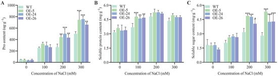 Osmoregulatory substance accumulation in the oilseed rape leaves under different NaCl stresses. (A) Pro content under different NaCl concentrations. (B) Soluble protein content under different NaCl concentrations. (C) Soluble sugar content under different NaCl concentrations. The error bars indicate standard deviations from three biological replicates (* p < 0.05; ** p < 0.01; *** p < 0.001).