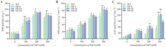 ROS scavenging capacity mediated by the DICW resistance module. (A) SOD activity in the oilseed rape under different NaCl conditions. (B) POD activity in the oilseed rape seedlings under different NaCl stresses. (C) CAT activity in the oilseed rape seedlings under different NaCl stresses. The error bars indicate the standard deviation of three biological replicates (* p < 0.05; ** p < 0.01; *** p < 0.001).