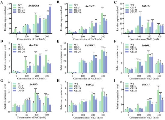 Expression analysis of stress-related genes in oilseed rape. (A–I) represent the expression levels of BnRD29A, BnP5CS, BnKIN1, BnLEA1, BnNHX1, BnSOS1, BnSOD, BnPOD, and BnCAT, respectively. The error bars indicate the standard deviation of three biological replicates (* p < 0.05; ** p < 0.01; *** p < 0.001).