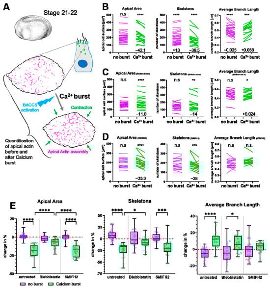 Actin network assembly in response to calcium bursts in MCCs: (A) Scheme: At stages 21–22, MCCs expressing BACCS components were recorded for 180 s. BACCS was activated to induce a calcium burst, resulting in apical contraction (green arrows) Apical area and the apical actin network were quantified and compared between a pre- and a post-burst timepoint. Xenopus illustrations © Natalya Zahn (2022) []. (B–D) Changes to the apical area and the actin network (number of skeletons, average branch length) in MCCs with and without calcium burst. (B) Untreated embryos, (C) Blebbistatin, (D) SMIFH2. Cells were recorded for 180 s and a calcium burst was induced after 12 s. Magenta lines show values for individual cells without a calcium burst, green lines for those with an induced calcium burst; end-points indicate the pre- and post-burst values. Statistical test: Wilcoxon matched pairs signed rank test. * p < 0.05; ** p < 0.01; *** p < 0.001; **** p < 0.0001; n.s. not significant. For significant changes, the median change is included in the graph. Mean and SD values are provided in Table S1. (E) Comparison of changes to the apical area and the actin network (number of skeletons, average branch length) between MCCs with and without calcium activity both for untreated, Blebbistatin-treated, and SMIFH2-treated embryos. Graphs show the changes presented in (B–D) in percent. Each data point represents an individual cell. Box and whiskers indicate quartiles. Dashed line indicates 0% (no change). Averages and SD: Apical Area (Untreated, no burst: +1.2 ± 3.5%; calcium burst: −19.3 ± 10.0%; Blebbistatin, no burst: −1.7 ± 3.9%; calcium burst: −7.5 ± 6.1%; SMIFH2, no burst: −0.3 ± 4.4%; calcium burst: −18.3 ± 8.1%). Skeleton number (Untreated, no burst: +8.1 ± 10.5%; calcium burst: −23.9 ± 15.8%; Blebbistatin, no burst: +1.6 ± 17.5%; calcium burst: −8.7 ± 11.5%; SMIFH2, no burst: +2.2 ± 10.1%; calcium burst: −18.9 ± 17.1%). Average branch length (Untreated, no burst: −5.7 ± 6.8%; calcium burst: +11.7 ± 10.0%; Blebbistatin, no burst: −4.1 ± 11.8%; calcium burst: +6.0 ± 9.0%; SMIFH2, no burst: −1.2 ± 11.0%; calcium burst: +2.2 ± 7.1%). Statistical test: 2-way ANOVA + Tukey’s multiple comparisons test. * p < 0.05; ** p < 0.01; *** p < 0.001; **** p < 0.0001; non-significant comparisons are not shown; 53 cells from 30 untreated embryos; 41 cells from 14 Blebbistatin-treated embryos; 39 cells from 18 SMIFH2-treated embryos.