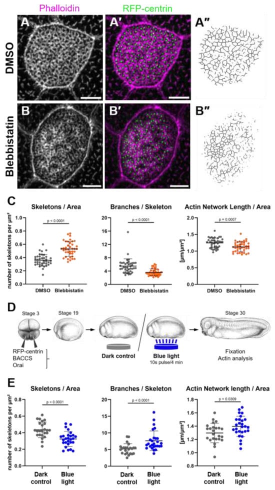 Non-muscle myosin II and recurring calcium bursts drive apical actin network development: (A–C) Maximum intensity projections of apical actin in MCCs of embryos treated with (A) DMSO or (B) 50 µM Blebbistatin from stage 19 to 30. (A’,B’) show actin labeled by phalloidin in magenta, and GFP-centrin-labeled basal bodies in green. Scale bars 5 µm. (A’’,B’’) show the skeletonized actin network. (C) Quantification of the apical actin network of MCCs in embryos treated with DMSO or Blebbistatin. Number of skeletons (separate actin structures) per µm2 (DMSO 0.36 ± 0.09; Blebbistatin 0.53 ± 0.11). Average branches per skeleton (DMSO 5.5 ± 2.2; Blebbistatin 3.6 ± 1.0). Length of the apical actin network normalized to surface area (DMSO 1.25 ± 0.15 µm−1; Blebbistatin 1.13 ± 0.15 µm−1). Error bars show mean and SD; 39 cells from 12 to 13 embryos analyzed per condition. Statistical test: Mann–Whitney Test (D,E) Effect of repeated induction of calcium bursts. (D) Experimental setup: Embryos expressing BACCS and Orai were grown in darkness or with 10 s pulses of 450 nm light every 4 min from stage 19 to 30. Xenopus illustrations © Natalya Zahn (2022) []. (E) Quantification of MCC apical actin: Number of skeletons per µm2 (Dark 0.44 ± 0.09; Blue 0.33 ± 0.09). Average branches per skeleton (Dark 5.2 ± 1.6; Blue 7.7 ± 3.0). Length of the apical actin network normalized to surface area (Dark 1.30 ± 0.15 µm−1; Blue 1.40 ± 0.15 µm−1). Error bars show mean and SD; 24–27 cells from 8 to 9 embryos analyzed per condition. Statistical test: Mann–Whitney Test.