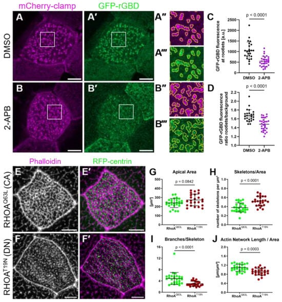 Small GTPases of the Rho family are regulators of the actin cytoskeleton, and RhoA plays an established role in MCC surface expansion and apical actin formation []. Previous studies have shown that active RhoA is present in close proximity to basal bodies during MCC development [,]. We thus asked whether 2-APB treatment interferes with the localization or activation of centriolar RhoA. Using GFP fused to the GTPase-binding domain of Rhotekin (rGBD) to identify RhoA activity [], we observed that activated RhoA primarily localized to the anterior rootlet, as visualized by mCherry-clamp (Figure 6A). When embryos were treated with 2-APB, apical rGBD reporter fluorescence was lower, and localization to the rootlet was disrupted compared to controls (Figure 6A–D). This finding supports a role for calcium in RhoA activation and suggests that RhoA activation occurs downstream of IP3-calcium signaling.