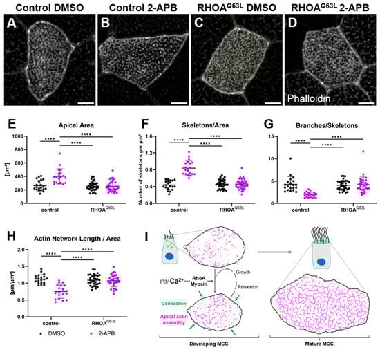 Apical actin truncation due to IP3R inhibition is rescued by constitutively active RhoA: (A–H) Maximum intensity projections of apical actin and quantification thereof in MCCs treated with DMSO or 2-APB and expressing constitutively active RHOAQ63L. Scale bars 5 µm. (E) Apical surface area (DMSO control: 263.3 ± 78.2 µm2; 2-APB control: 402.1 ± 112.2 µm2; DMSO RHOAQ63L: 255.5 ± 65.6 µm2; 2-APB RHOAQ63L: 254.5 ± 79.7 µm2). (F) Number of skeletons (separate actin structures) per µm2 (DMSO control: 0.44 ± 0.11; 2-APB control: 0.84 ± 0.17; DMSO RHOAQ63L: 0.46 ± 0.10; 2-APB RHOAQ63L: 0.46 ± 0.12). (G) Average branches per skeleton (DMSO control: 4.3 ± 1.7; 2-APB control: 1.9 ± 0.6; DMSO RHOAQ63L: 4.1 ± 1.1; 2-APB RHOAQ63L: 4.2 ± 1.7). (H) Length of the apical actin network normalized to surface area (DMSO control: 1.12 ± 0.13 µm−1; 2-APB control: 0.75 ± 0.20 µm−1; DMSO RHOAQ63L: 1.09 ± 0.16 µm−1; 2-APB RHOAQ63L: 1.07 ± 0.18 µm−1). Error bars show mean and SD; 31–51 cells from 10 to 16 embryos analyzed per condition. Statistical test: 2-way ANOVA + Tukey’s multiple comparisons test. **** p < 0.0001. (I) Model depicting the role of calcium, myosin, and RhoA in the maturation of the apical actin network. Green arrows symbolize the apical contraction following a calcium burst. Apical actin is depicted skeletonized in pink.