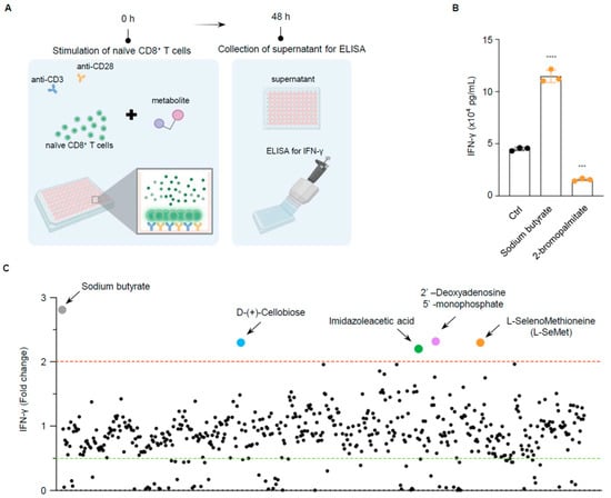 We screened a collection of metabolites derived from the gut microbiota to identify potential agonists of CD8+ T cells. This metabolite library included 554 compounds derived from enteric microorganisms (Table S1). To evaluate the impact of these metabolites on T cell function, we developed an in vitro screening system (Figure 1A). Naïve CD8+ T cells were isolated from mouse spleens and cultured in plates pre-coated with anti-CD3 and anti-CD28 antibodies in the presence of metabolites. The purity of the naïve CD8+ T cells had to exceed 95% (Figure S1A,B). Activated T cells rapidly produce inflammatory cytokines upon transitioning from their naïve state. As interferon γ (IFN-γ) is a key cytokine predominantly produced by cytotoxic T lymphocytes (CTLs), we measured IFN-γ levels using an ELISA assay as an indicator of CD8+ T cell effector function. To validate the system, we chose sodium butyrate [], a microbiota metabolite reported to enhance CD8+ T cell function, and 2-Bromopalmitate (2-BP) [], a metabolite known to inhibit CD8+ T cell activation. Consistent with previous studies, butyrate markedly amplified IFN-γ secretion by CD8+ T cells, whereas 2-BP had the opposite effect (Figure 1B). This indicates that the system we established is suitable for screening potential CD8+ T cell agonists.