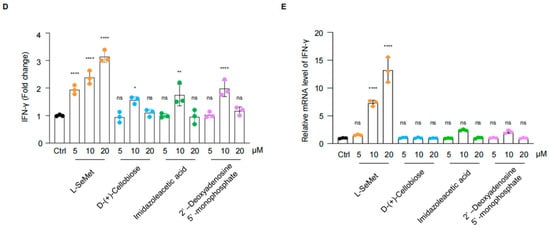 The screening concentration was set to one-thousandth of the stock solution. Specifically, metabolites from plates 1 to 9 were screened at a concentration of 10 μM, plates 10 and 11 at 2 μM, and plates 12 and 13 at 3 μg/mL. This screening concentration was selected to ensure the nontoxicity of DMSO, the primary solvent, which was maintained at less than one-thousandth of the culture medium. Among the 554 gut microbiota metabolites, we identified four compounds that increased IFN-γ secretion in CD8+ T cells by more than twofold (Figure 1C). Further validation of these compounds revealed that L-selenomethionine (L-SeMet) exhibited the most pronounced enhancement of IFN-γ secretion at both the transcriptional and translational levels in a dose-dependent manner. Nevertheless, the other three compounds did not show a dose-dependent promotional effect (Figure 1D,E).