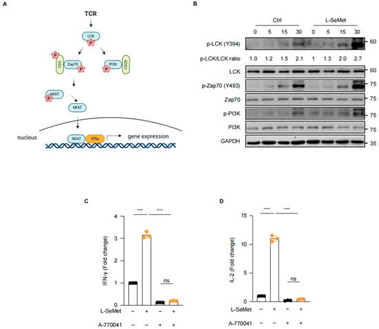 We hypothesized that L-SeMet enhances the effector functions of CD8+ T cells by strengthening the activation of the TCR signaling pathway. Therefore, we analyzed the TCR signaling pathway in L-SeMet-treated CD8+ T cells. Naïve CD8+ T cells sorted from mouse spleens were stimulated with anti-CD3/28 antibodies for 5, 15, and 30 min. Cells collected at each time point were subjected to Western blot analysis to detect the phosphorylation of key proteins in the TCR signaling pathway. Our results showed that in naïve CD8+ T cells from the control group, the phosphorylation levels of key TCR signaling proteins, including LCK (Y394), ZAP70, and PI3K, gradually increased with anti-CD3/28 activation. Remarkably, co-stimulation of CD8+ T cells with L-SeMet led to a significant enhancement in the phosphorylation levels of LCK (Y394), ZAP70, and PI3K during activation (Figure 4B). Additionally, we added the LCK inhibitor A-770041 [] to L-SeMet-treated CD8+ T cells and found that the addition of the LCK inhibitor completely abolished T cell activation promoted by L-SeMet (Figure 4C,D). Taken together, these results suggest that L-SeMet amplifies TCR signaling in CD8+ T cells, indicating that L-SeMet enhances T cell activation via LCK-mediated pathways.