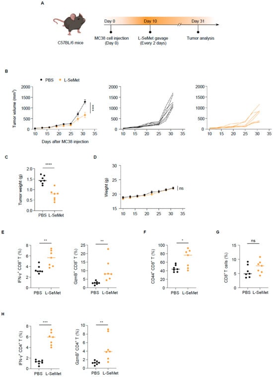 L-SeMet inhibits colorectal cancer growth by enhancing CD8+ T cell effector functions. (A) Schematic experimental procedure in (B–H): Mice were inoculated with MC38 cells at day 0 and were gavage with L-SeMet or PBS every 2 days. At day 31, the tumor was harvested. (B) Tumor growth curves: Effect of L-SeMet administration compared to that of the control group on MC38 tumor growth in C57BL/6 mice (left), and the tumor growth curves of every mouse treated with PBS (middle) and L-SeMet (right). (C) Tumor weight. At day 31, after inoculation of MC38 cells, the tumors were harvested and weighed. (D) Mice weight. During administration, the weight of the mice was recorded. (E–H) Tumor-infiltrating immune cells were examined: Percentage of IFN-γ+, GzmB+ cells among CD8+ T cells (E), CD44+ cells among CD8+ T cells (F), and CD8+ T cells among CD45+ T cells (G). Percentage of IFN-γ+ and GzmB+ cells among CD4+ T cells (H); n = 7. Each symbol in (E–H) represents a measurement from an individual mouse. Data in (B,D) are the mean ± s.e.m.; data in (C,E–H) are the mean ± s.d. Statistics were analyzed by two-way ANOVA (B,D) and unpaired two-tailed Student’s t-test (C,E–H); * p < 0.05; ** p < 0.01; *** p < 0.001; **** p < 0.0001; ns, no significant difference.
