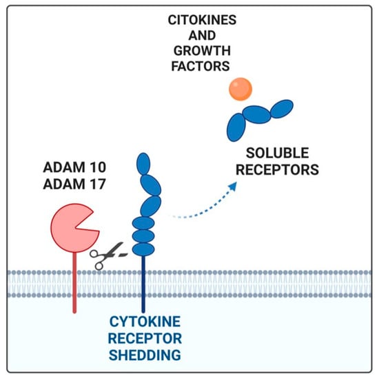 In this scenario, the soluble receptors should be emphasized due to their unique characteristics that make them promising prognostic and diagnostic markers in various diseases, including cancer [,]. Soluble receptors can be measured easily and non-invasively in a patient’s serum, retain their high binding affinity with the ligand, can reach target tissues even from a distant injection or production site, and can often mediate their effects with a pleiotropic action on different cell types than that of classical receptors. Soluble cytokine receptors are created through several mechanisms: (i) proteolytic cleavage of an existing membrane receptor (ectodomain-shedding), (ii) synthesis of an mRNA lacking the transmembrane domain sequence, via alternative mRNA splicing or the use of intronic alternative polyadenylation (PAS) sites, and (iii) release of transmembrane receptors through extracellular vehicles, such as exosomes []. Ectodomain shedding is a process in which transmembrane proteins exposed on the cell surface or cellular organelles are proteolytically cleaved and released by enzymes, called “sheddases”. The cleaved extracellular domain (ectodomain) of a membrane-bound receptor is released into the extracellular space and transported in a soluble form. The key enzymes in ectodomain shedding are the well-known ADAM family (Figure 1) []. They consist of a catalytic metalloproteinase domain that functions in shedding, a disintegrin domain, a cysteine-rich domain, a transmembrane domain, and a C-terminal cytoplasmic domain that is involved in activity regulation. The short C-terminal fragment (CTF) that remains at the plasma membrane because of receptor cleavage is further processed by the γ-secretase protease complex to release the intracellular domain (ICD) fragment. Among the ADAM family, ADAM10 and ADAM17, which have similar structures, are directly involved in the pathogenesis of different tumors [,]. ADAM10 and ADAM17 modulate tumor progression through their influence on several distinct cellular pathways. Indeed, they affect cell–cell interactions and cell migration, releasing cell adhesion molecules. In addition, ADAM10 and ADAM17 are involved in the shedding of EGFR ligands regulating, in turn, the activation of the EGFR tyrosine kinase family []. In gastric cancer patients, ADAM10 and ADAM17 are associated with cancer progression and are biomarkers of poor prognosis [,]. Cytokine receptors cleaved by sheddases include class I cytokine receptors (e.g., IL-2 receptor and IL-6 receptor), the tumor necrosis factor (TNF) receptor superfamily, and the IL-1 receptor/Toll-like receptor superfamily [,].
