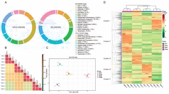 (A) Classification of 2716 metabolites detected by UPLC-MS/MS and GC-MS in the four types of licorice. (B) Correlation analysis. (C) PCA score plot. The sample groups are color-coded: red for Glycyrrhiza aspera; blue for Glycyrrhiza pallidiflora; green for Glycyrrhiza inflata; and orange for Glycyrrhiza uralensis. (D) Hierarchical clustering analysis (HCA) of secondary metabolites, with metabolites categorized into clusters. The normalized signal intensities of the metabolites are visualized as a color spectrum, where different colors represent different relative levels (red indicates high levels, green indicates low levels).