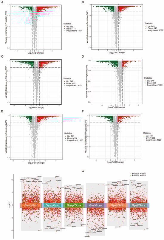 Volcano plots depicting the differential metabolite expression levels across various licorice comparison groups. (A) Glycyrrhiza aspera vs. Glycyrrhiza inflata. (B) Glycyrrhiza aspera vs. Glycyrrhiza pallidiflora. (C) Glycyrrhiza aspera vs. Glycyrrhiza uralensis. (D) Glycyrrhiza inflata vs. Glycyrrhiza uralensis. (E) Glycyrrhiza pallidiflora vs. Glycyrrhiza inflata. (F) Glycyrrhiza pallidiflora vs. Glycyrrhiza uralensis. (G) Overall multi-group differential volcano plot for all comparison groups, showcasing the top 10 most significant differential metabolites in each comparison.
