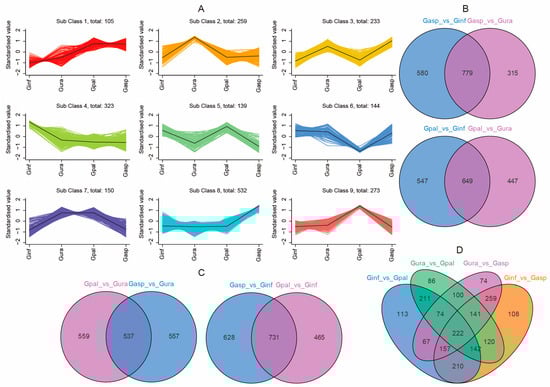 Differential metabolomic analysis of the four types of licorice. (A) K-means plot of differential metabolites. The x-axis represents the samples, and the y-axis represents the relative abundance of standardized metabolites. (B,C) Venn diagrams of differential metabolites for each group comparison: (B) Glycyrrhiza aspera vs. Glycyrrhiza inflata/Glycyrrhiza aspera vs. Glycyrrhiza uralensis, Glycyrrhiza pallidiflora vs. Glycyrrhiza inflata/Glycyrrhiza pallidiflora vs. Glycyrrhiza uralensis. (C) Glycyrrhiza pallidiflora vs. Glycyrrhiza uralensis/Glycyrrhiza aspera vs. Glycyrrhiza uralensis, Glycyrrhiza aspera vs. Glycyrrhiza inflata/Glycyrrhiza pallidiflora vs. Glycyrrhiza inflata. (D) Venn diagram of differential metabolites in multiple pairwise comparisons: Glycyrrhiza inflata vs. Glycyrrhiza pallidiflora/Glycyrrhiza uralensis vs. Glycyrrhiza pallidiflora/Glycyrrhiza uralensis vs. Glycyrrhiza aspera/Glycyrrhiza inflata vs. Glycyrrhiza aspera. Different colors represent different sets, overlapping areas represent the intersections of different comparison groups, and the numbers indicate the number of shared metabolites. The non-overlapping areas indicate the number of unique metabolites in each comparison group.