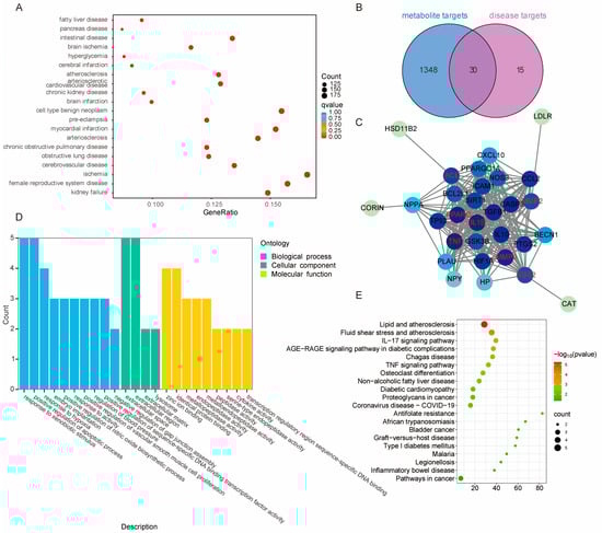 Therefore, we further screened all detected substances for active ingredients using three databases—TCMSP, SwissDrugDesign, and SymMap—to determine the key active components promoting human health in the four Glycyrrhiza species. Our comprehensive analysis identified 299 metabolites as potential active ingredients in TCM, corresponding to 2044 substance targets. These targets were then subjected to Disease Ontology (DO) enrichment analysis to link the targets with diseases (Supplementary Table S3). Our disease enrichment analysis revealed that the substance targets are related to multiple diseases. We screened the top 20 diseases with a p-value < 0.05 (Figure 4A) and found that the majority belonged to cardiovascular system diseases (six diseases). The next most common were respiratory system diseases (three diseases) and urinary system diseases (two diseases). Additionally, five diseases belonged to multiple major categories, with four of these falling under both cardiovascular and nervous system diseases. Therefore, we believe that licorice can effectively target cardiovascular system diseases, respiratory system diseases, urinary system diseases, and nervous system diseases.