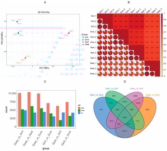 Transcriptome sequencing was performed on the roots of four Glycyrrhiza species. After filtering raw data and checking sequencing error rates and GC content distribution, we obtained 82.95 Gb of clean data from 12 samples, with each sample yielding over 6 Gb of clean data and a Q30 base percentage of 94% or higher. Post quality control, the clean reads were aligned to the Glycyrrhiza uralensis reference genome (Bioproject ID: PRJDB3943) [], with alignment rates ranging from 79.90% to 94.92% and an average alignment rate of 89.99% (Table 1). This indicates that the high-quality RNA-seq data is suitable for further analysis. Principal Component Analysis (PCA) (Figure 5A) and a correlation heatmap (Figure 5B) confirmed the high consistency among samples within the same group, making them suitable for Differentially Expressed Genes (DEG) analysis. To comprehensively understand the functions of the genes obtained from transcriptome analysis, gene function annotation was performed using seven major databases (KEGG, NR, Swiss-Prot, Tremble, KOG, GO, and Pfam). Specifically, 19,561 genes were annotated based on the KEGG database; 13,350 genes based on the NR database; 20,353 genes based on the Swiss-Prot database; 11,558 genes based on the Tremble database; 15,178 genes based on the KOG database; 24,713 genes based on the GO database; and 23,833 genes based on the Pfam database (Supplementary Table S4).