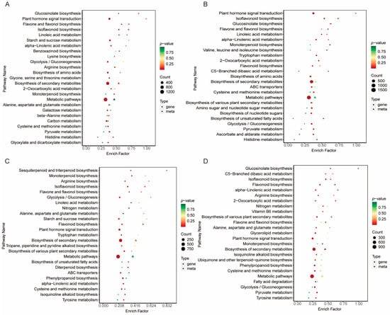 A KEGG enrichment analysis was performed on the shared differential metabolites and differentially expressed genes (DEGs) across the various comparison groups. A combined analysis of 222 differential metabolites and 1299 DEGs from the four comparison groups was conducted. For each comparison, the top 25 most significantly enriched pathways were displayed in a scatter plot (Figure 6A–D). It was observed that in the Ginf vs. Gasp group, the differential metabolites and DEGs were primarily enriched in pathways such as glucosinolate biosynthesis, plant hormone signal transduction, flavone and flavonol biosynthesis, isoflavonoid biosynthesis, and linoleic acid metabolism. In the Gasp vs. Gura group, they were mainly enriched in plant hormone signal transduction, isoflavonoid biosynthesis, glucosinolate biosynthesis, flavone and flavonol biosynthesis, and linoleic acid metabolism. In the Gpal vs. Ginf group, the main enrichments were in sesquiterpenoid and triterpenoid biosynthesis, monoterpenoid biosynthesis, arginine biosynthesis, isoflavonoid biosynthesis, and flavone and flavonol biosynthesis. For the Gpal vs. Gura group, the differential metabolites and DEGs were primarily enriched in glucosinolate biosynthesis, C5-branched dibasic acid metabolism, isoflavonoid biosynthesis, flavonoid biosynthesis, and alpha-linolenic acid metabolism.