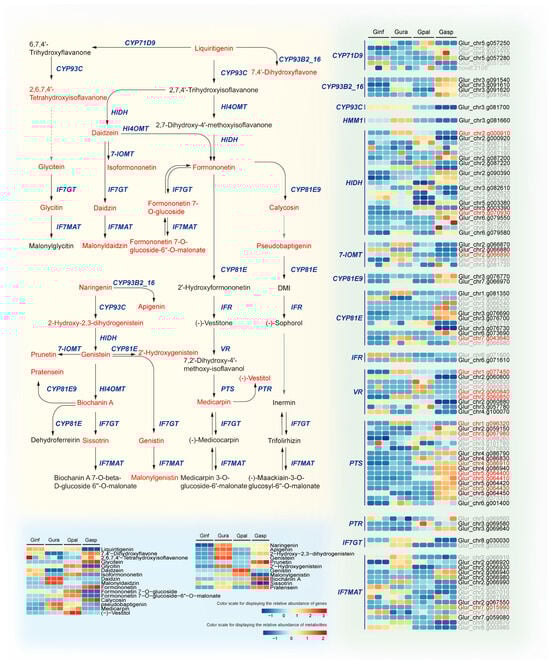 We found that a total of 61 DEGs encode 14 key enzymes involved in isoflavonoid biosynthesis, including two flavonoid 6-hydroxylases (CYP71D9 [EC:1.14.13.-]), three flavone synthase IIs (CYP93B16 [EC:1.14.19.76]), one 2-hydroxyisoflavanone synthase (CYP93C [EC:1.14.14.87]), one 2,7,4′-trihydroxyisoflavanone 4′-O-methyltransferase (HMM1 [EC:2.1.1.212 2.1.1.46]), 11 2-hydroxyisoflavanone dehydratases (HIDH [EC:4.2.1.105]), three isoflavone-7-O-methyltransferases (7-IOMT [EC:2.1.1.150]), two isoflavone 3′-hydroxylases (CYP81E9 [EC:1.14.14.88]), six isoflavone 2′-hydroxylases (CYP81E [EC:1.14.14.90 1.14.14.89]), one 2′-hydroxyisoflavone reductase (IFR [EC:1.3.1.45]), seven vestitone reductases (VR [EC:1.1.1.348]), 13 pterocarpan synthases (PTS [EC:4.2.1.139]), two pterocarpan reductases (PTR [EC:1.23.1.-]), one isoflavone 7-O-glucosyltransferase (IF7GT [EC:2.4.1.170]), and eight isoflavone 7-O-glucoside-6″-O-malonyltransferases (IF7MAT [EC:2.3.1.115]). Notably, three genes, 7-IOMT (EC:2.1.1.150) (Glur_chr2.g066890), CYP81E (EC:1.14.14.90 1.14.14.89) (Glur_chr7.g043640), and IF7MAT (EC:2.3.1.115) (Glur_chr7.g015990), showed significant differences in all pairwise comparisons among the four Glycyrrhiza species. Additionally, HIDH (EC:4.2.1.105) (Glur_chr2.g000910, Glur_chr5.g070930), VR (EC:1.1.1.348) (Glur_chr1.g077450, Glur_chr2.g060840, Glur_chr2.g060850), and PTS (EC:4.2.1.139) (Glur_chr1.g096320, Glur_chr3.g067980, Glur_chr4.g086910, Glur_chr5.g064400, Glur_chr5.g064410, Glur_chr5.g064430) were also significantly different in all pairwise comparisons. Furthermore, 26 DEMs were detected. A comprehensive analysis of isoflavonoid biosynthesis in the four Glycyrrhiza species revealed the biosynthetic mechanisms, clearly showing the differences in isoflavonoid biosynthesis (Figure 7).