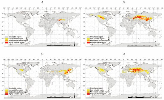 Current potentially suitable areas for four licorice species. (A) Glycyrrhiza inflata. (B) Glycyrrhiza uralensis. (C) Glycyrrhiza pallidiflora. (D) Glycyrrhiza aspera.