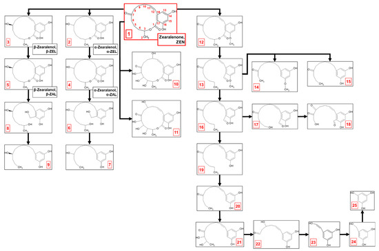 Zearalenone biodegradation by M. anisopliae—proposition of pathway. Metabolite numbers correspond to the designated identifiers in Table 2.