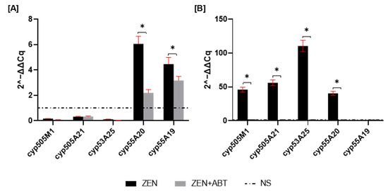 mRNA expression of genes involved in ZEN removal after 1 (A) and 2 (B) days of incubation. Results are presented as the mean ± SD. Statistically significant differences were marked as *—(p < 0.0001).