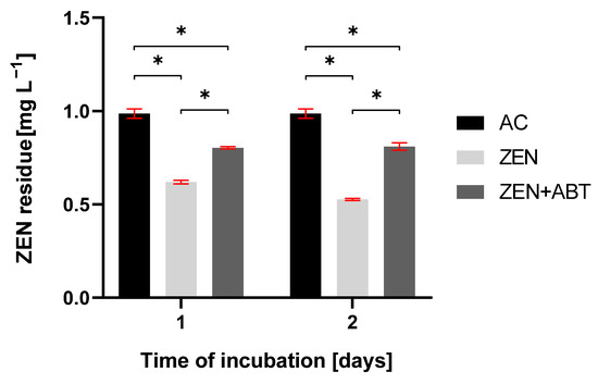 The residue of zearalenone (ZEN) in abiotic control (AC), tested sample of Metarhizium anisopliae treated with ZEN, and tested sample of Metarhizium anisopliae treated with ZEN and 1-aminobenzotriazole (ZEN + ABT) after 1 and 2 days of incubation. Results are presented as the mean ± SD. Statistically significant differences were marked as *—(p < 0.0001).