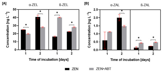 In contrast to the observed trends in ZEL metabolites, the ZAL analysis revealed distinct patterns. Still, the α-form was predominant (Figure 4). Although no statistically significant differences in α-ZAL production were observed between ZEN and ZEN + ABT treatments after 1 day, a significant inhibition of α-ZAL production was evident in the presence of the inhibitor after 2 days. While β-ZAL production was relatively low in ZEN-treated cultures, adding a CYP450 inhibitor resulted in a two-fold increase in β-ZAL levels at 1 and 2 days of incubation.