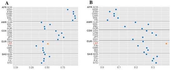 Minor allele frequency (MAF) distribution of the studied (A) rs7041 and (B) rs4588 among populations. MAF in Latvians (current study) is marked in orange. MAF for each population listed on the y-axis is marked in blue. Subpopulation groups: EAS—East Asia; EUR—European; AFR—African; AMR—Mixed American; SAS—South Asia. (According to the Ensembl database (1000 Genomes Project data, https://www.internationalgenome.org/category/ensembl/ accessed on 30 June 2023).