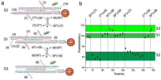 The self-assembled dynamic DNA structure generating the nano-ruler comprises AuNP-modified Rail A, i.e., partial duplex (1)/(2), the roller ssDNA quasi-ring strand (3), and Rail B, i.e., Cy3-functionalized ssDNA (4) or (5). The structure exists in six configurations: States S1, S2, and S3, carrying a Cy3 functionality internal to strand (4). Strand (5) has the same sequence as strand (4) but with Cy3 positioned at the 3′ end, realizing states S4, S5, and S6. The dynamic reconfigurations are operated by additional strands (6), (7), and (8) and their respective complementary strands (6*), (7*), and (8*) via the toehold-assisted strand displacement mechanism. Strands (9) and (10) rigidify the structure, limiting the oscillations and allowing for precise fluorophore–plasmonic surface relative positioning. Figure 1b shows a stepwise scheme of the DNA structure self-assembly. A typical self-assembly process of the nano-ruler DNA scaffold is associated with a 50–80% yield, as already reported [], while AuNP decoration was assumed to produce the final product with a high yield (close to 100%) due to the excess of DNA-modified AuNPs used (see also Supplementary Materials). It should be noted that the final structure was not purified, and small amounts of defective assemblies are expected to be present in the final solution.