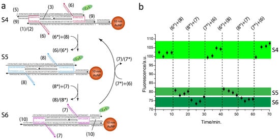 Mechanical control of fluorescence properties of the nano-ruler through strand displacement reactions. (a) Three discrete configurations S4, S5, and S6 were obtained, generating three specific Cy3-AuNP separating distances. Operating DNA strands (6), (7), and (8) are colored red, pink, and blue, respectively, and the complementary sequences are indicated as (6*), (7*), and (8*). (b) Fluorescence emission levels recorded at (λ = 565 nm) associated with slider reconfigurations across states S4, S5, S6, S4, S5, S6, and S4.