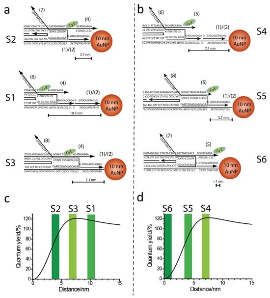 To address the different emission levels, we used geometrical considerations to calculate the expected Cy3-AuNP distances for the different states. Figure 4a,b shows slider geometric schemes associated with different values for the separating distances that are equal to 10.5, 7.1, and 3.7 nm, associated with states S1, S3, and S2, and distance values equal to 7.1, 3.7, and <1 nm, associated with states S4, S5, and S6 (see also Supplementary Materials for additional details on the calculated distances). These values were compared to the theoretical enhancing/quenching effects using a published model [] (Figure 4c,d). Indeed, the results are in good agreement with the model, confirming the correct assumptions for the geometric considerations.