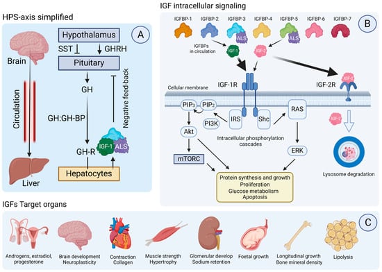 Brief schematic representation of (A) the Hypothalamic–Pituitary–Somatotropic (HPS) axis, (B) the IGF intracellular signaling, and (C) IGFs target organs. SST: somatostatin; GHRH: growth hormone releasing hormone; GH: growth hormone; GH-BP: growth hormone binding protein; GH-R: growth hormone receptor; ALS: acid labile subunit; PIP2: phosphatidylinositol 4,5-bisphosphate; PIP3: phosphatidylinositol (3,4,5)-trisphosphate; PI3K: phosphoinositide 3-kinase; IRS: insulin receptor substrate; Shc: Shc signaling adaptor protein; RAS: rat sarcoma; ERK: extracellular signal-regulated kinase; Akt: protein kinase B; mTORC: mammalian target of rapamycin; IGFBP: insulin-like growth factor binding protein; IGF: insulin-like growth; IGF-1R: insulin-like growth 1 receptor; IGF-2R: insulin-like growth 2 receptor.