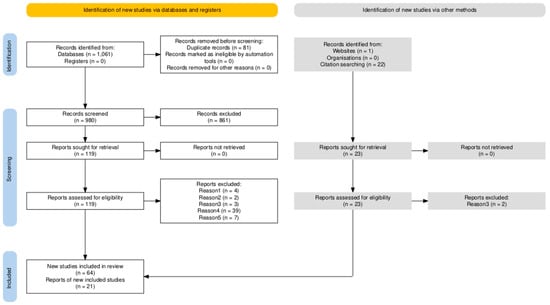PRISMA flow diagram illustrating the study selection process for this review. The diagram shows the records identified from databases and other sources, the number of records excluded at each stage (duplicates, exclusion criteria, etc.), and the final number of studies included in the review [27].