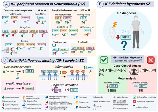 Summary of the main research on peripheral IGF levels in schizophrenia. (A) Shows IGF peripheral research for SZ in studies comparing SZ patients versus healthy controls and comparisons before/after pharmacological treatment. (B) The IGF deficient hypothesis states that reduced IGF-1 levels could be expected in SZ patients; therefore, we briefly resume case-control studies that are in favor of this hypothesis and others which are against. (C) Potential influences and hypothesis behind alterations in the IGF system in SZ patients. References in the figure are indicated in brackets.