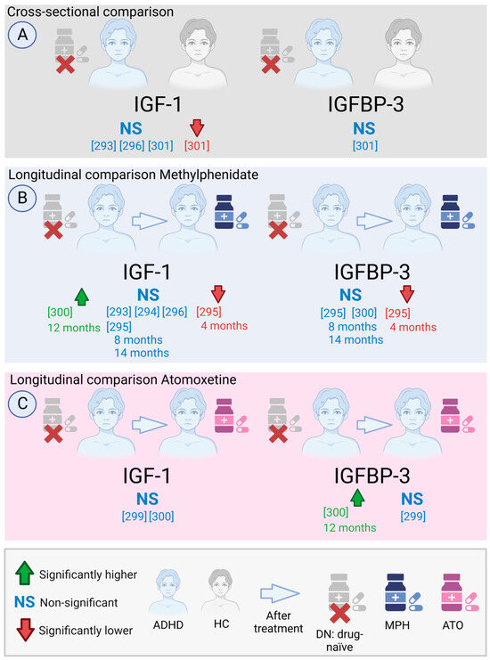 - Bereket, A.; Turan, S.; Karaman, M.G.; Haklar, G.; Ozbay, F.; Yazgan, M.Y. Height, weight, IGF-I, IGFBP-3 and thyroid functions in prepubertal children with attention deficit hyperactivity disorder: Effect of methylphenidate treatment. Horm. Res. 2005, 63, 159–164. [Google Scholar] [CrossRef] [PubMed]