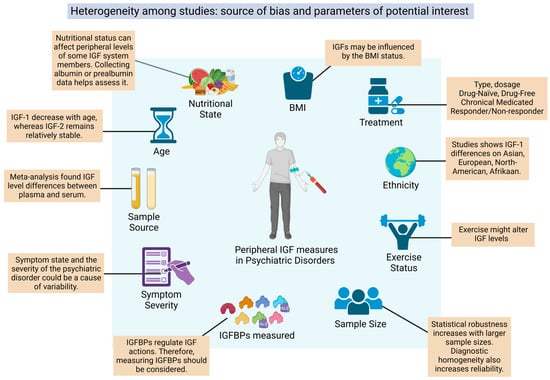 Psychiatric disorders (PDs) represent a significant global health burden, affecting millions of individuals and their families worldwide. These mental conditions often result in chronic disability, diminishing the quality of life, and creating substantial societal costs [1]. Despite recent advancements in the understanding of their underlying biological mechanisms, the diagnosis of PDs still remains a subjective clinical assessment based on observed symptoms, which can vary considerably among individuals and be very unspecific [2]. The actual paradigm therefore has several limitations, including delayed or inaccurate identification of PDs and difficulties in predicting treatment responses. In this context, there is an urgent need for objective and reliable biomarkers, measurable indicators of biological processes, or pathophysiological conditions that can help psychiatrists not just in the process of diagnosis but in the monitoring of clinical progression and in the evaluation of treatment response [3]. In recent decades, the search for biomarkers in psychiatry has gained attention, focusing on molecular, genetic, and imaging approaches. However, peripheral biomarkers in plasma or serum are particularly attractive due to their less invasive, cheaper, and faster accessibility and potential to reflect central nervous system (CNS) processes [4]. In this framework, the insulin-like growth factor (IGF) family, including IGF-1, IGF-2, and their binding proteins (IGFBPs), has emerged as a potential candidate for biomarker research in PDs, mainly for its implications in neuroplasticity and cognition [5].