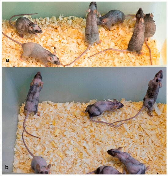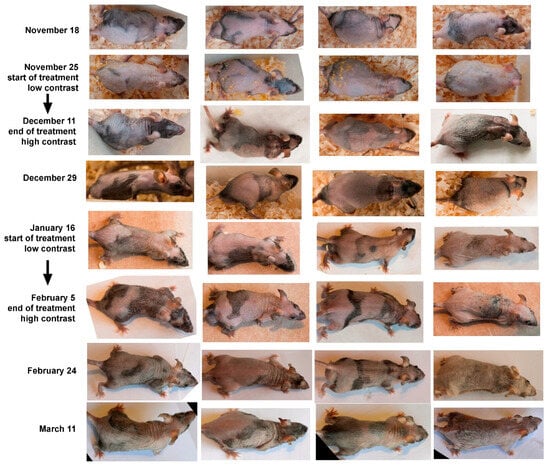 The we/we wal/wal mice were chosen because of their hair characteristics. The spontaneous homozygous we (wellhaarig) mutation, characterized by a wavy coat and curly whiskers, results from a defect in epidermal transglutaminase 3 (Tgm3) [21]. The Tgm3 mutation alters the crosslinking of proteins in the hair cortex and may therefore affect the hair phenotype [21]. The molecular nature of the genetic defect in wal (waved alopecia) is still unknown; however, the coordinates of the chromosomal locus containing the wal gene have been determined on mouse chromosome 14 [22]. Genome-wide sequencing of wal/wal mice found only an abnormality outside the wal zone, a mutation in the Slc9a9 gene, which is unlikely to be associated with the wal phenotype [23]. Phenotypically, the wal mutation in a homozygous recessive state is manifested by a wavy coat. Over time, partial baldness develops, leading to a thinning of the coat in mice. More severe abnormalities in hair follicle morphogenesis were found in we/we wal/wal double mutants; thus, Tgm3 has a modifying effect on the wal gene, increasing alopecia in the double mutants. The mutations that occurred in these mice did not allow the hair to grow long [24,25,26], so the skin was always visible through the hair, allowing us to track hair follicles in the anagen stage. It is known that at the onset of anagen in black mice the skin turns black, but in normal mice, we do not see this because the hair coat completely covers the skin. Thus, we/we wal/wal mice are like permanently shaved black mice.