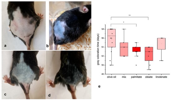 Effect of fatty acid treatment on the onset of anagen in C57Bl/6 mice. (a)—control, 57 days old; (b)—palmitic acid, 54 days old; (c)—oleic acid, 54 days old; (d)—same mouse as in 3c at 57 days old; (e)—graph of the appearance of gray skin coloration when treated with different fatty acids. * p < 0.05, ** p < 0.01.