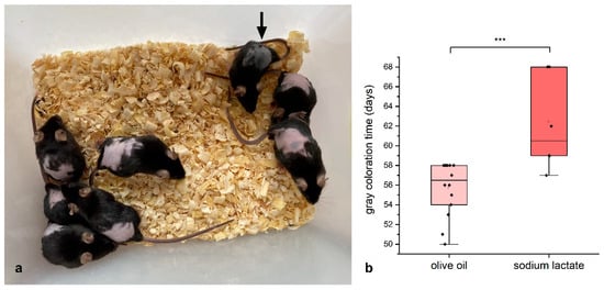 The effect of lactate on the onset of the anagen in C57Bl/6 mice. (a)—mice treated with lactate that reached the age of 60 days. The arrow shows a mouse in anagen. (b)—graph of the appearance of gray coloration of the skin. *** p < 0.005.