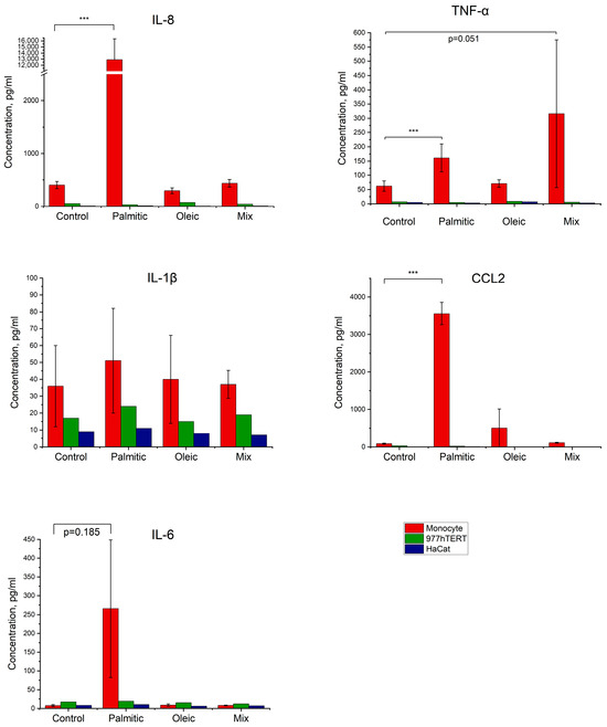 Experiments showed that fibroblasts and keratinocytes had little or no response to the addition of different fatty acids. In monocytes, we observed pronounced responses (Figure 5). Palmitic acid significantly induced the synthesis of TNF-a, IL-8, and CCL2. In the case of IL-6, we observed a tendency toward activation; in the case of IL-1b, there was no activation. The mixture of fatty acids had no significant effect.