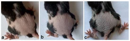 The process of skin color change during induction of anagen. (a)—is the day before the mouse turned gray, (b)—is the day when it started to turn gray, (c)—is the day after it started to turn gray. It can be seen that there is a clear difference.