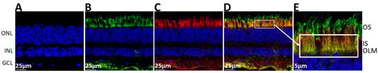 Representative immunofluorescent labeling images of human retina with human serum containing anti-TULP1 AAbs. (A) No antibody, DAPI-stained nuclei (blue), (B) staining with serum positive for anti-TULP1 antibody (green), (C) control staining with anti-TULP1 MAb (red), (D,E) double stain with anti-TULP1 MAb and TULP1-positive human sera showing overlapping binding (yellow); arrow indicates a larger magnification of a staining overlap between the inner segments of photoreceptor cells. Abbreviations: OS, outer segments; IS, inner segments; OLM, outer limiting membrane; ONL, outer nuclear layer; INL, inner nuclear layer; GCL, ganglion cell layer.
